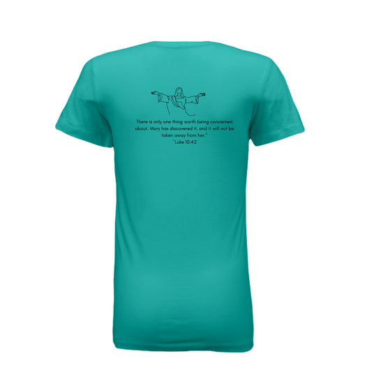 "Less Martha, More Mary" with verse on back Luke 10:41 t shirt tee