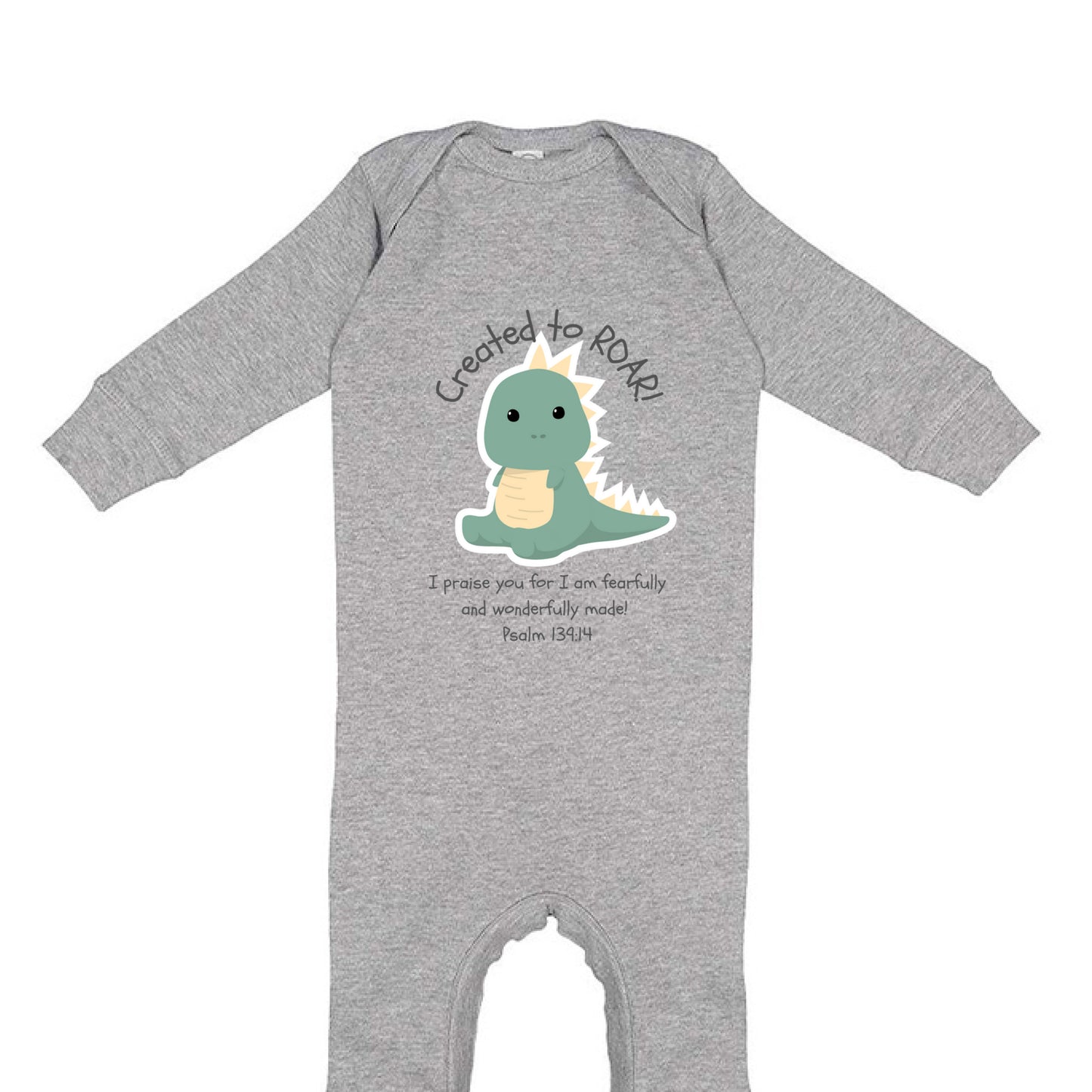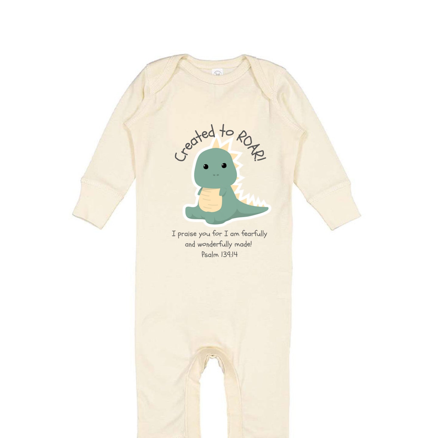 Created to ROAR! Baby Long Sleeved, bodysuit with adorable t-rex design tyrannosaurus rex dinosaur Psalm 139:14