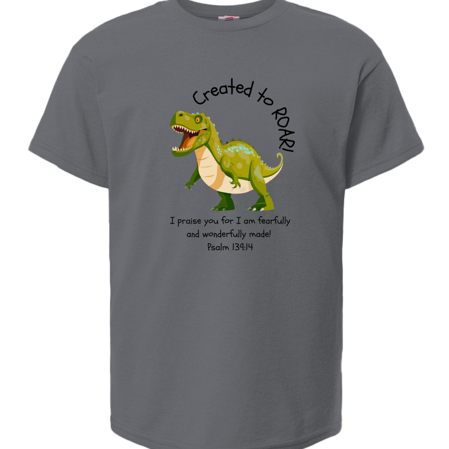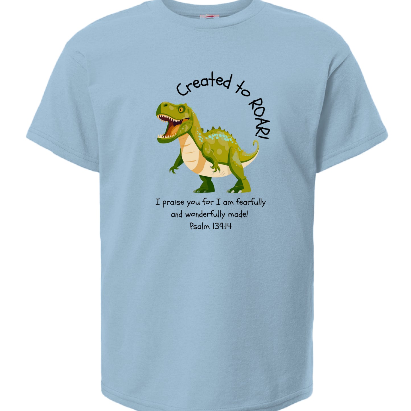 Created to Roar kids t shirt with Tyrannosaurus Rex Dinosaur design Psalm 139:14