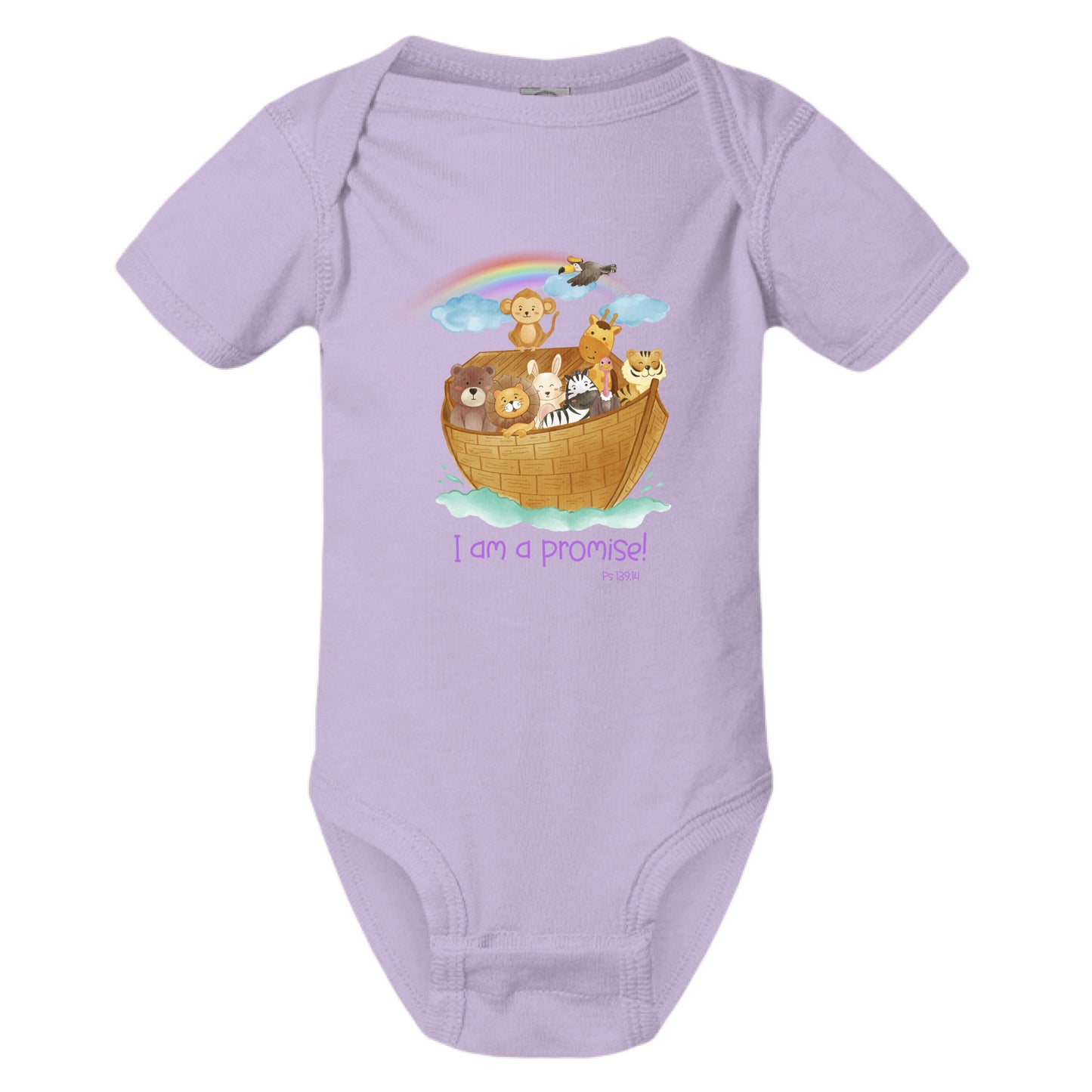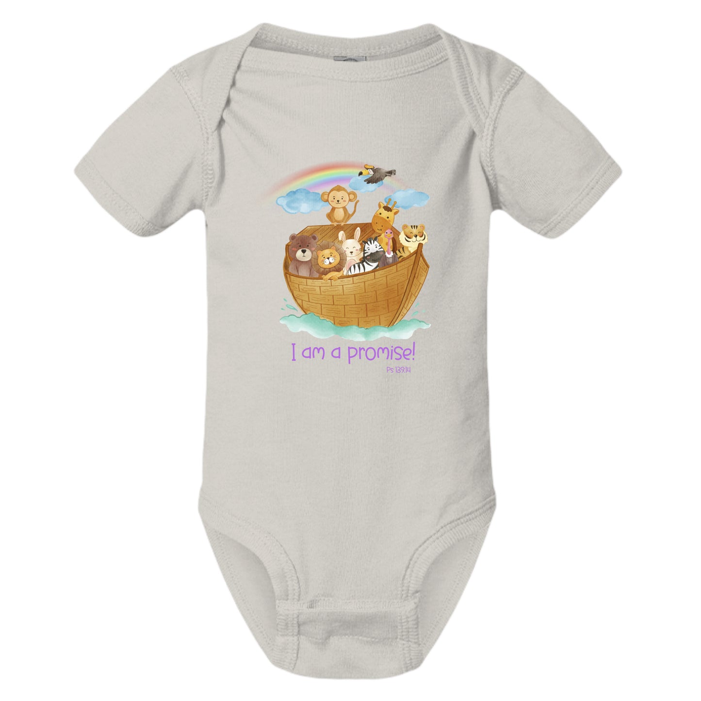 Dress your little one in this adorable cotton onesie featuring a charming Noah's Ark design paired with the uplifting message "I am a promise" from Psalms 139:14. Soft, breathable fabric ensures comfort all day, while the playful print adds a touch of joy to any outfit. Perfect for celebrating faith and fun in one cozy piece.