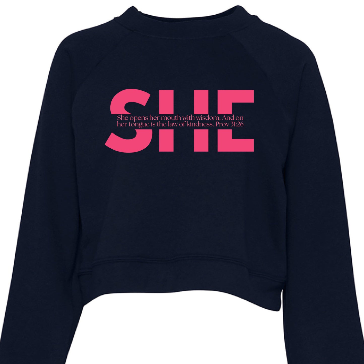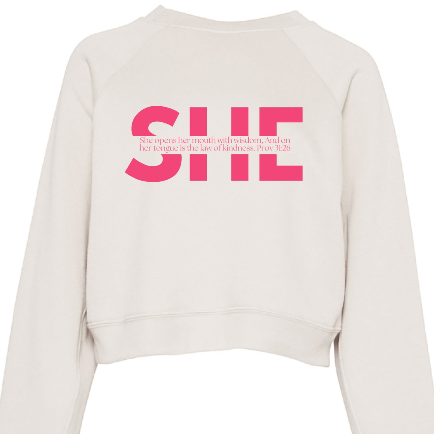 "SHE"-Virtuous Woman Proverbs 31:26 Cropped Raglan Fleece Pullover Godly and Stylish womens attire